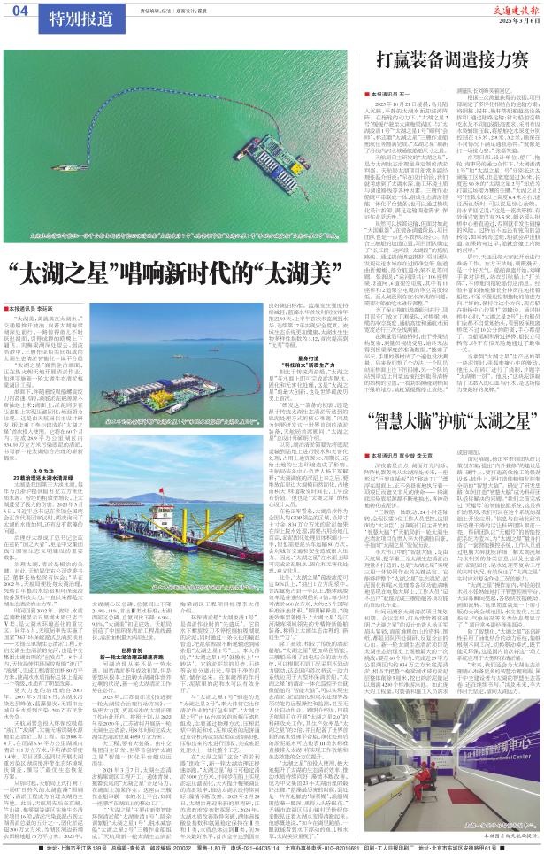 太湖生态清淤智能化一体平台船由新型智能环保清淤船“太湖浚清1 号”、除杂调节船“太湖之星1 号”和脱水减容船“太湖之星2 号”组成。