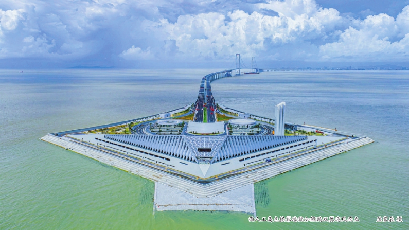 俯瞰伶仃,面积相当于19个标准足球场的深中通道西人工岛,一手挥起跨海大桥“飘带”,一手舞着沉管隧道“长龙”,将珠江口两岸城市群紧紧连在一起。作为集桥隧转换、管理维护、科教观光为一体的功能枢纽,西人工岛主要承担运营管理、应急救援等功能,也是深中通道的先行工程和建设的起点。